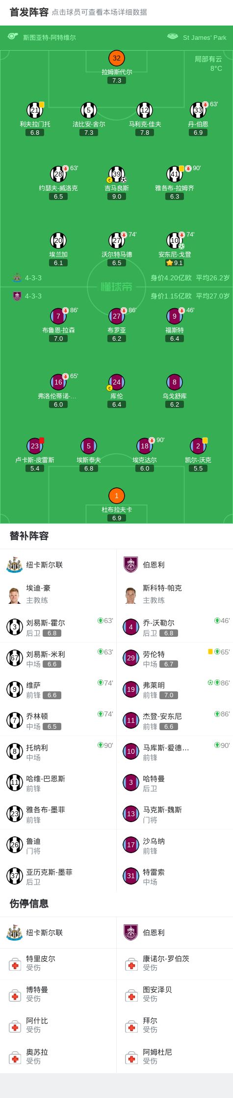 第31分钟,吉马良斯角球直接罚进球门,纽卡1-0领先