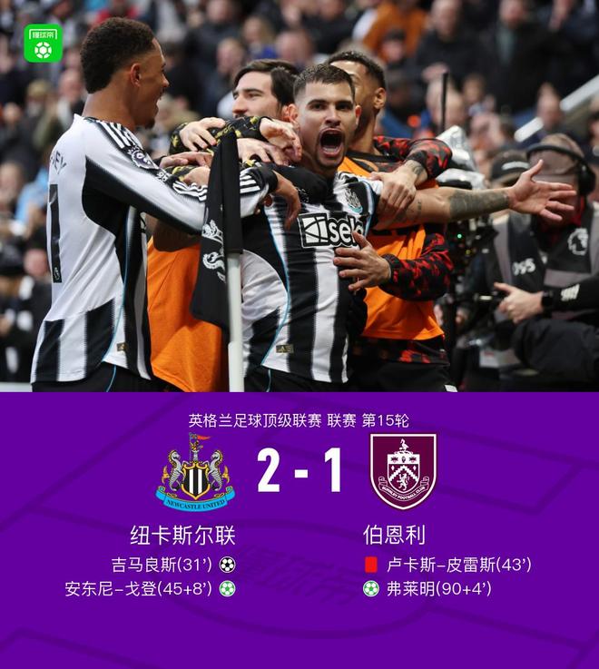 北京时间12月6日英超联赛 第15轮,纽卡斯尔联主场对阵伯恩利。上半场,吉马良斯直接角球破门。卢卡斯-皮雷斯放倒埃兰加吃到红牌。乌戈舒库手球送点,安东尼-戈登点球命中。下半场,拉姆齐手球送点,弗莱明点射破门扳回一城。最终纽卡斯尔主场2-1力克伯恩利。